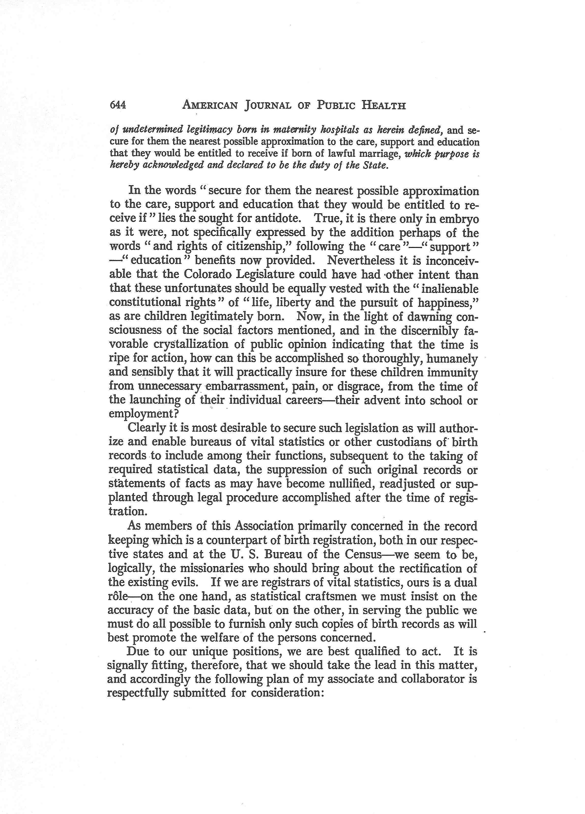 Heisterman suggested that an adopted child should be issued a second birth certificate reflecting his or her new name. … It was left, however, to two enterprising registrars of vital statistics, not federal officials, social workers, or adoptive parents, to put forth a concrete plan of issuing new birth certificates to adopted children. …Howard and Hemenway … characterized their professional brethren as ‘missionaries who should bring about the rectification of the existing evils’ in the birth registration of children born out of wedlock…”