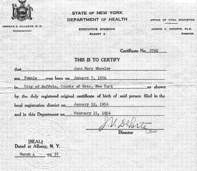 The following document is Joan Mary Wheeler’s Amended – Falsified – “Birth” Certificate.