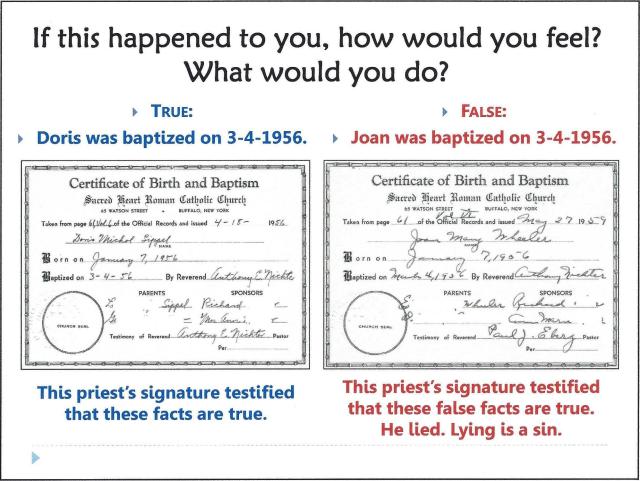 This, of course, creates lies on religious documents as well. Joan Wheeler’s baptism never happened. Joan did not exist on the date of the baptism listed on her certificate. Note that the Sponsors remain the same on both documents. They are Doris’s Aunt and Uncle.