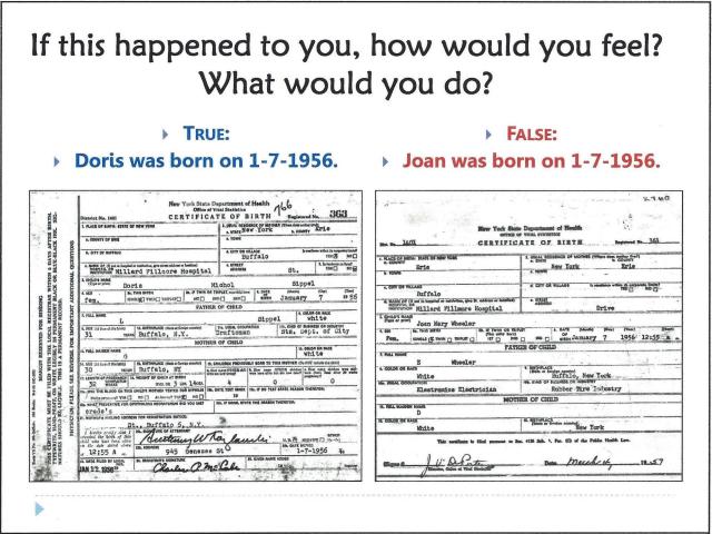 In June 2016, at the age of 60, I legally reclaimed my name that should have been mine since birth. New York State changed my name when I was 15 months old in compliance with a 1935 State law that revokes, seals, and replaces birth certificates of adopted people.[5] But I still do not have the legal right to unseal and obtain a certified copy of my accurate birth certificate.
