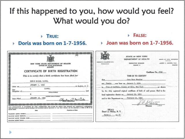 Using my own factual birth certificate and falsified birth certificate as a comparison, I will prove the difference between a medical record of live birth and a falsified birth certificate issued after court-ordered adoption.