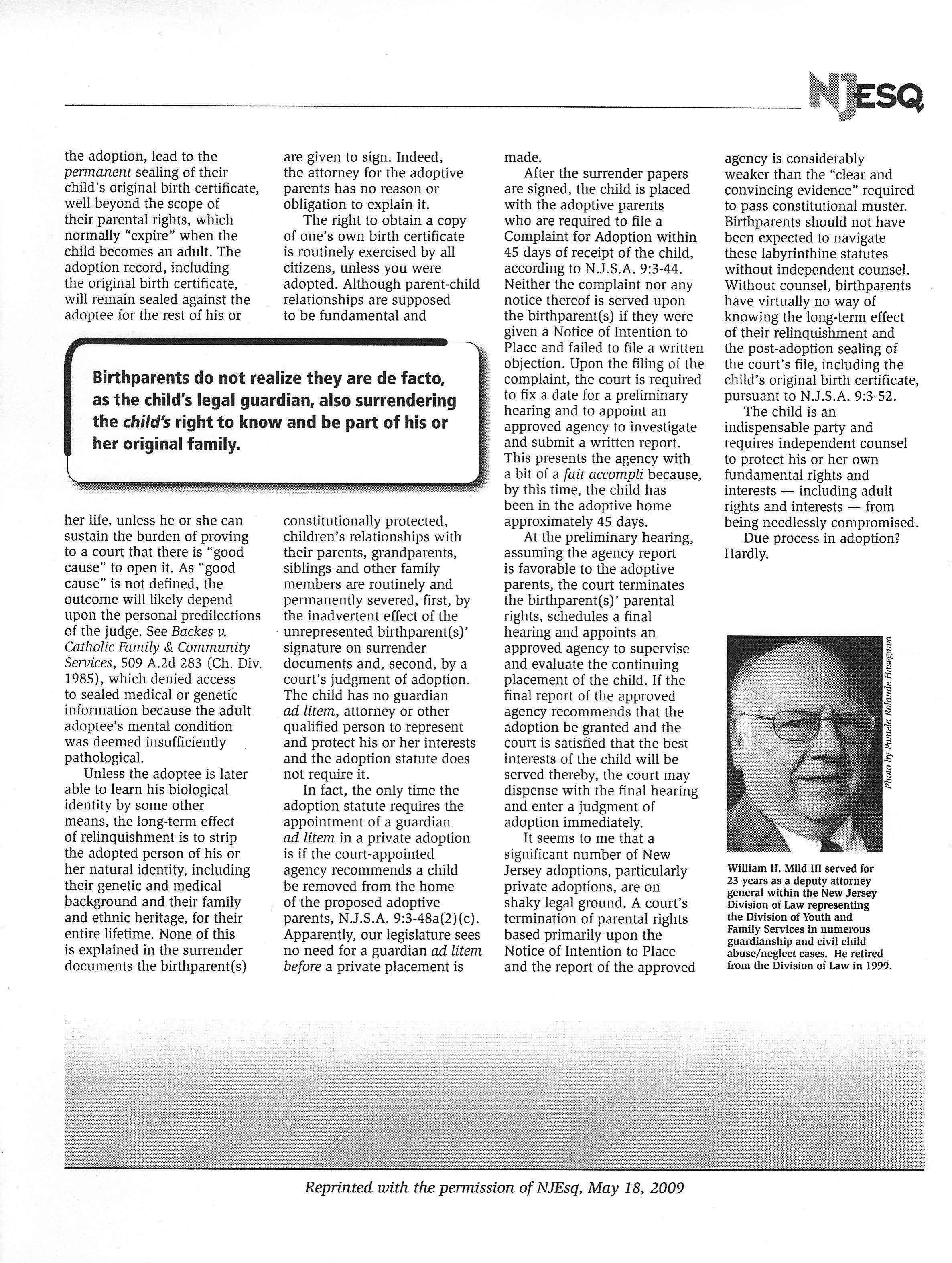 In May of 2010, William H. Mild III, retired attorney, forwarded this published version of his May 18, 2009 article: Due Process in Adoption? Hardly. With his permission, this may be freely distributed.