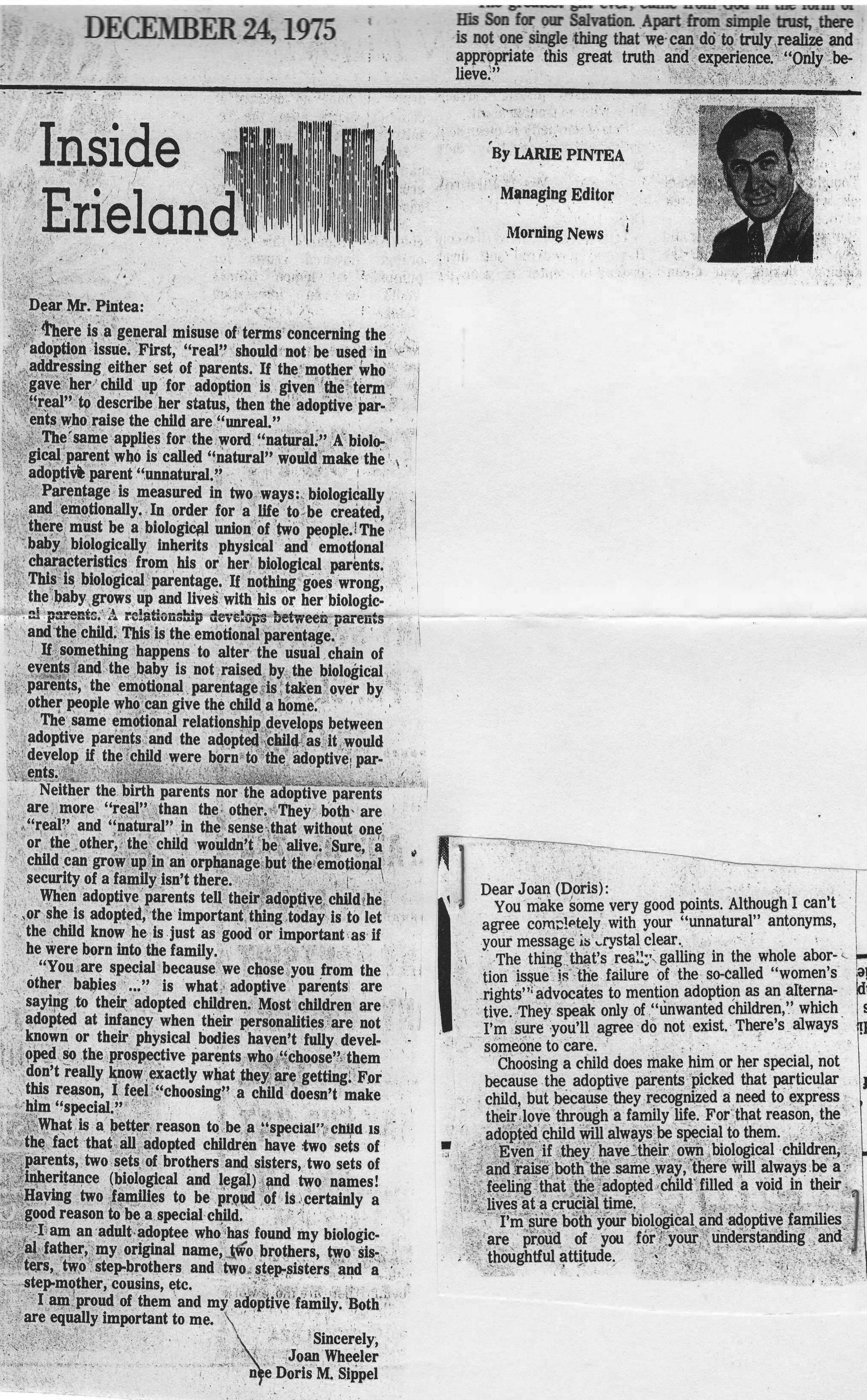 My next projects were Letters to the Editor of the Erie Morning News. I hesitate to publicize my earliest writings because of the juvenile nature, but these are the beginnings of the only way I knew how to react to the trauma of my adoption. These are the writings of a 19 year old college student.